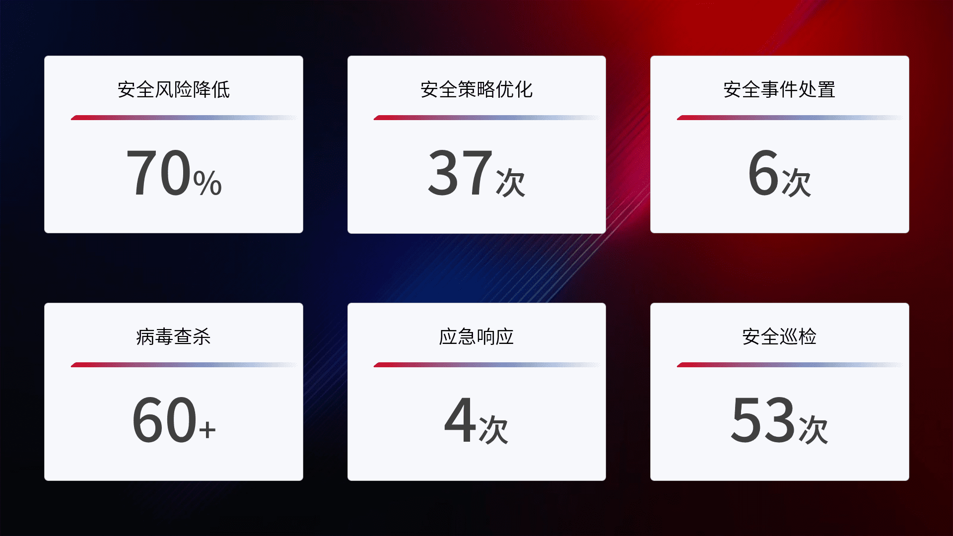 提供全面的安全事件报告体系,,,,包括处置报告、、周报、、季度和年度总结,,,结合持续监控,,,帮助客户深入了解网络安全状况。。。。