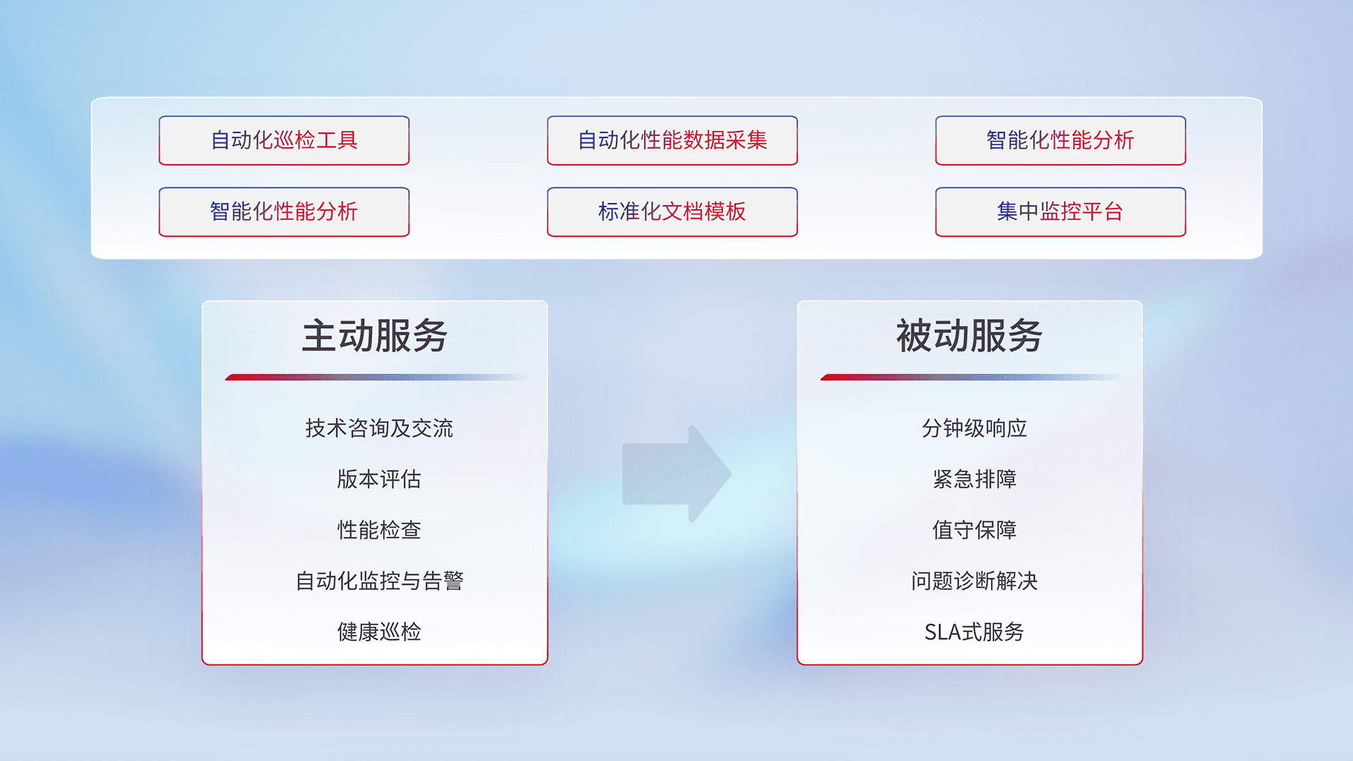智能化工具和标准化文档,,,保障服务质量,,提供主动服务(包含技术咨询、、版本评估、、性能检查、、、、自动化监控与告警、、健康巡检)和被动服务包含(分钟级响应、、、紧急排障、、、值守保障、、、问题诊断解决、、、SLA服务)。。。