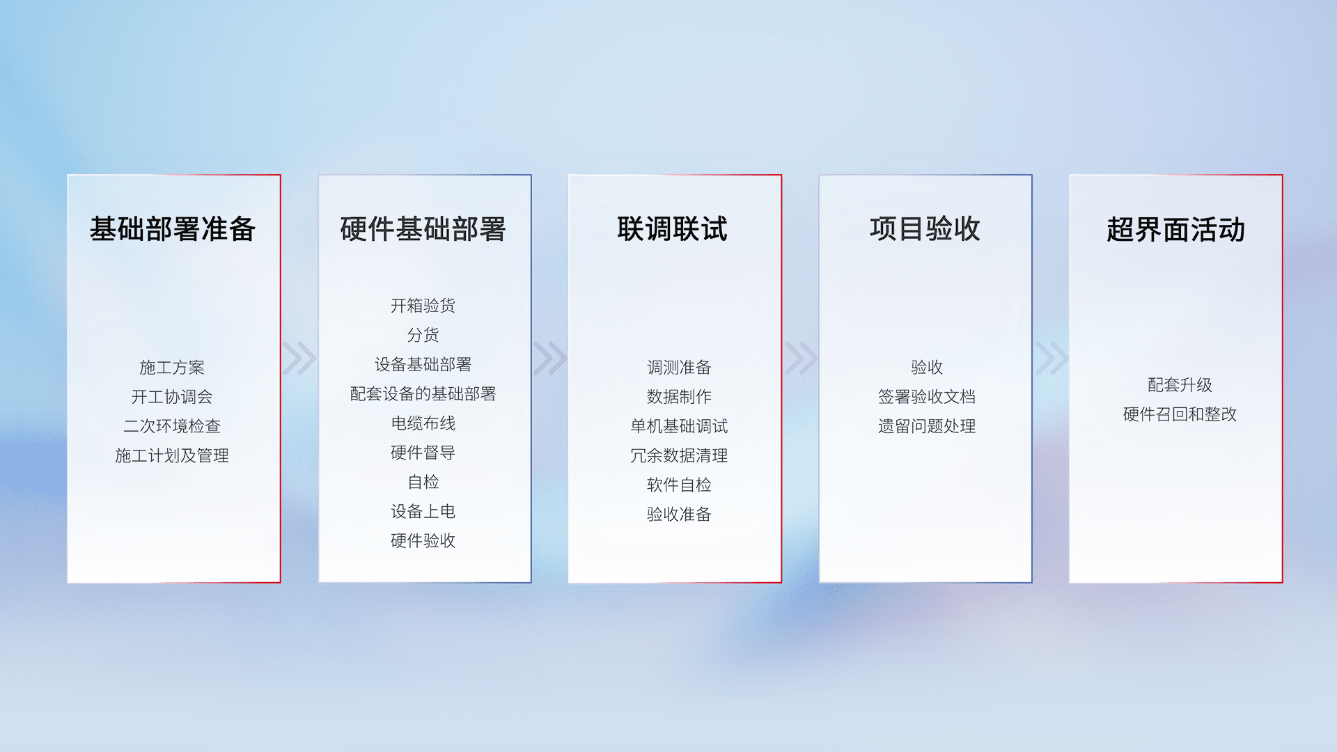 从基础部署准备、、硬件基础部署、、联调联试、、、、项目验收、、、、越界面活动的全过程可追溯,,,保证施工质量和进度。。